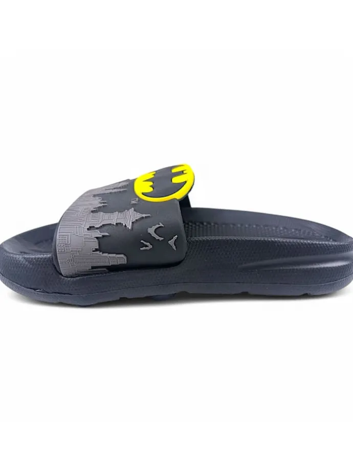 Das markante Batman-Logo und die Stadtsilhouette machen die Badeschuhe zu einem echten Blickfang.