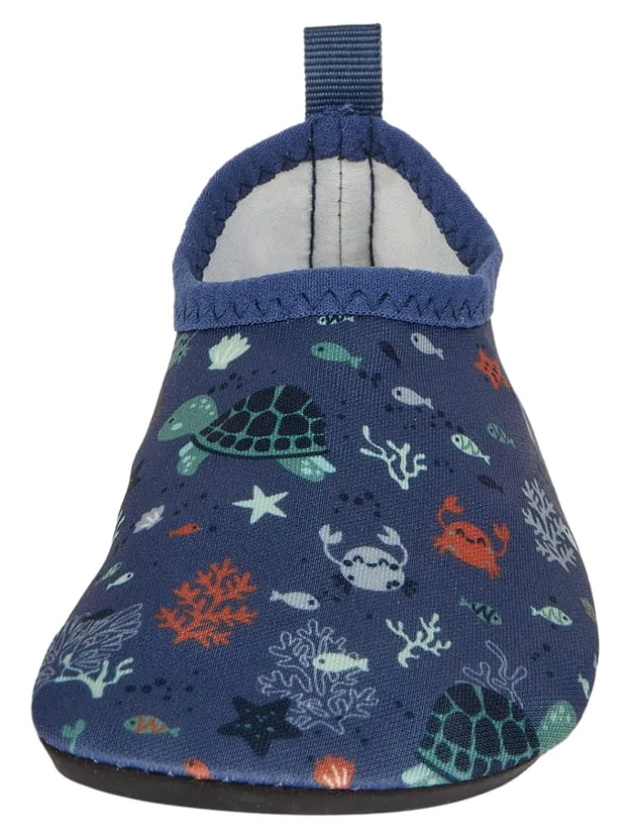 Badeschuhe aus Funktionsmaterial bedruckt mit Unterwasser Motiven.