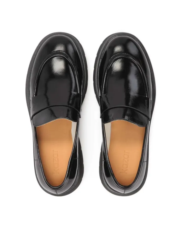 Die schwarzen flachen Damenschuhe aus hochwertigem Narbenleder sind ein klassisch geschnittenes Modell in moderner und extravaganter Ausführung. Ein schlichter Schaft zum Hineinschlüpfen mit dem für Loafer typischen Kreuzriemen wird mit einer Stollensohle mit ausgeprägtem Absatz und Profil gepaart. Die ultra-bequemen flachen Schuhe sind die perfekte Ergänzung zu Ihrem Alltagslook.