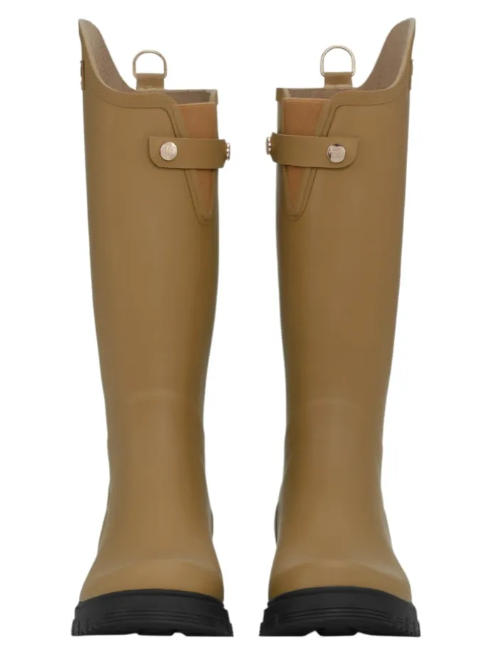 Kniehohe, asymmetrische Gummistiefel. Eine Kombination aus Stil und Funktionalität für regnerische Tage. Mit einem dekorativen D-Ring in der hinteren Mitte und einem Logo auf dem Schaft. Elastischer Gummizug für einfachen Einstieg und ein Riemen mit goldenen Logo-Knöpfen für die Dekoration. Die Gummisohle sorgt für eine hervorragende Traktion auf nassen Oberflächen.