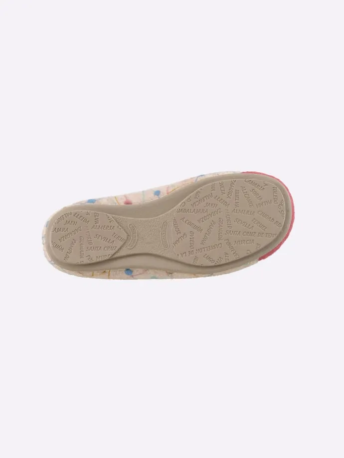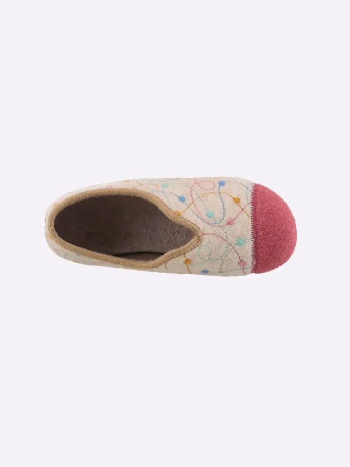 Frech, fröhlich und dazu so weich und kuschelig: Hausschuh mit V-Schnitt für einen leichten Einstieg. Textiles Obermaterial mit Pünktchen-Muster und bunten Nähten. Innen auch aus Textil. Flexible, rutschhemmende Laufsohle, ca. 10 mm Absatz. Weite G.