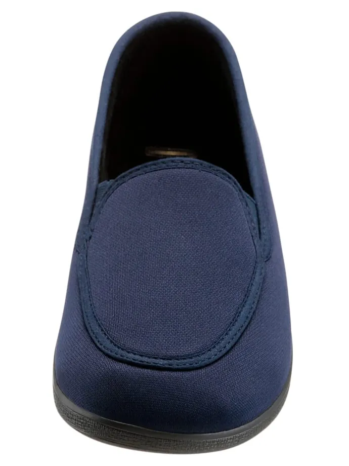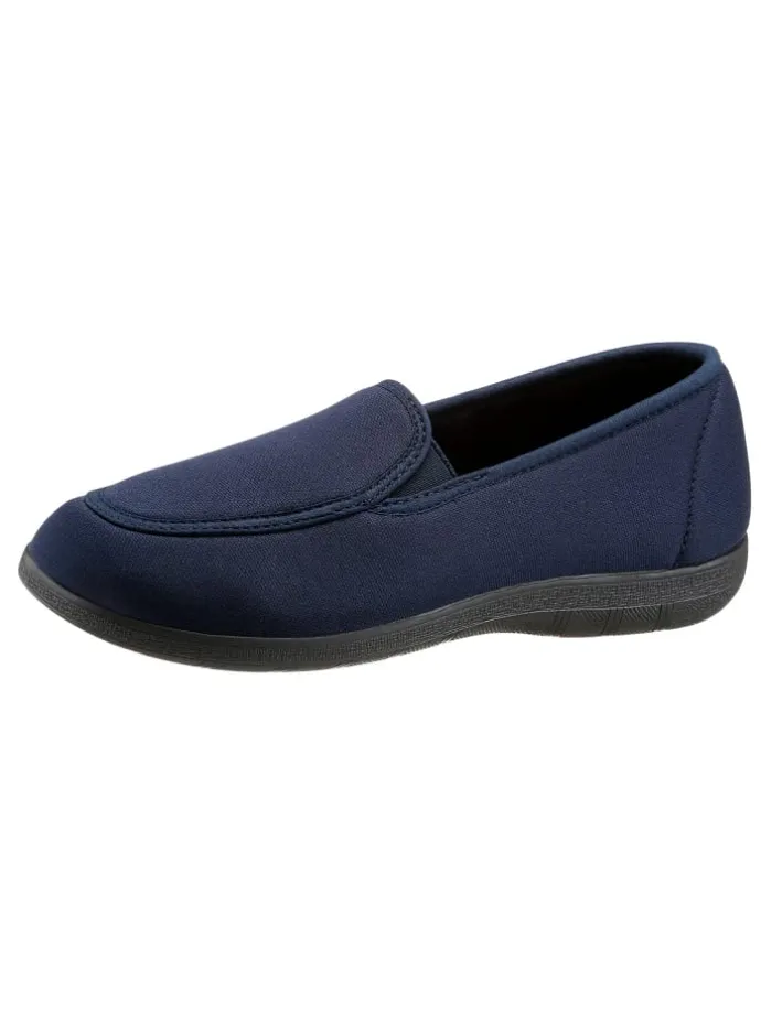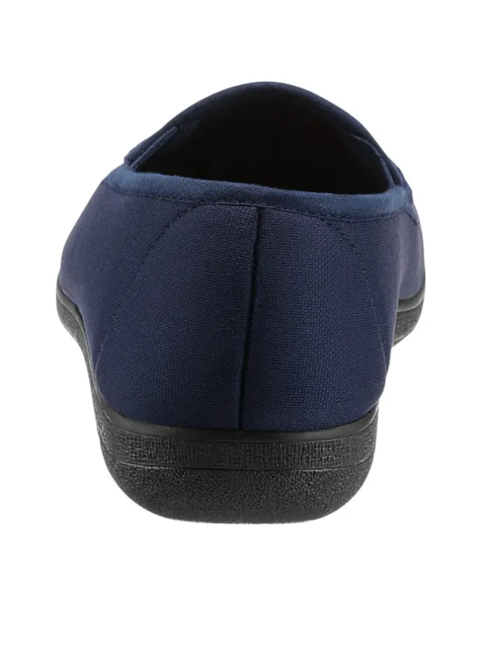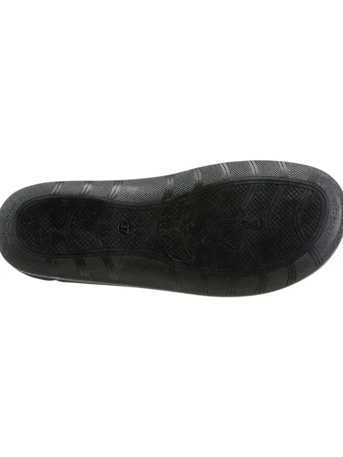 Komfortabler Hausschuh – ideal bei sensiblen Füßen wegen dem elastischen Obermaterial. Mit 2 Gummizügen am Rist. Innenausstattung: Baumwolle. Rutschhemmende Gummi-Laufsohle mit Keilabsatz. Weite H.