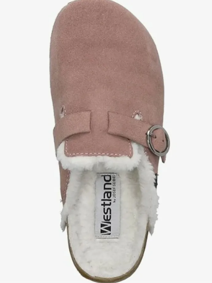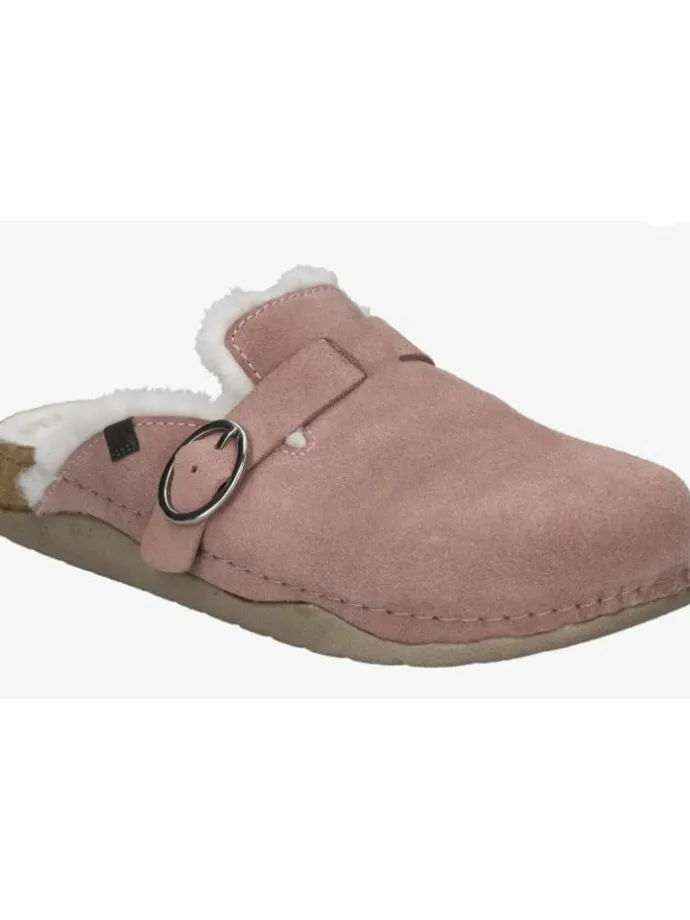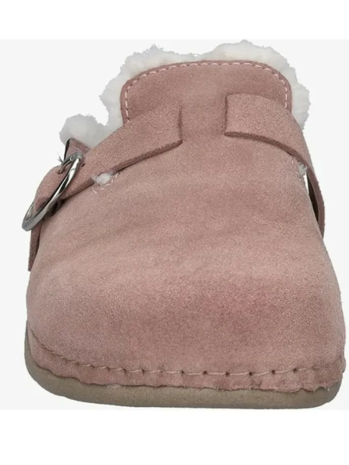 Weicher, rosafarbener Hausschuh mit flauschigem Innenfutter. Slip-On-Design, bequeme Passform und rutschfeste Sohle. Geeignet für gemütliche Stunden zuhause; sichtbare Merkmale: rosa Oberseite mit weichem Fellinnenfutter.