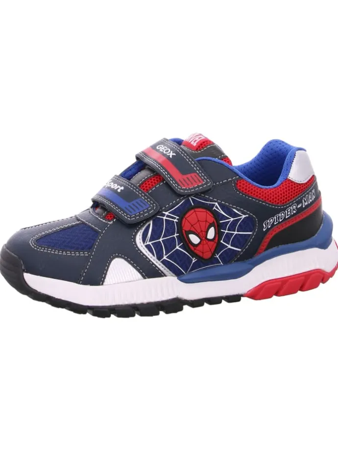 Lässiger und atmungsaktiver Juniorsneaker, ein Modell im Outdoor-Style aus der Zusammenarbeit von Geox und Marvel. Grafiken, Patches und Details auf der Sohle und am Schaft sind Spider-Man gewidmet und in den typischen Farben des Superhelden Marineblau und Rot gehalten. Tuono ist ein Modell mit praktischem Doppelklettverschluss aus Mesh und Material in Walklederoptik, der perfekte Begleiter für das Spielen im Freien mit Freunden und Schulkameraden.