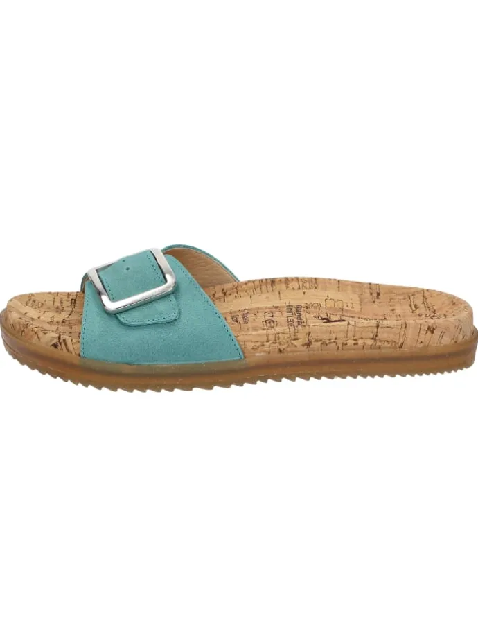 Klassische Pantolette in G-Weite mit einer Bandage aus Kalbleder, die innen mit Microfaser-Textil gefüttert ist und einen optischem Akzent durch eine Schließen-Garnitur hat. Anatomisches Kork-Fußbett und eine leicht profilierte Gummisohle ergänzen diesen Sommerschuh in bewährter Weise.