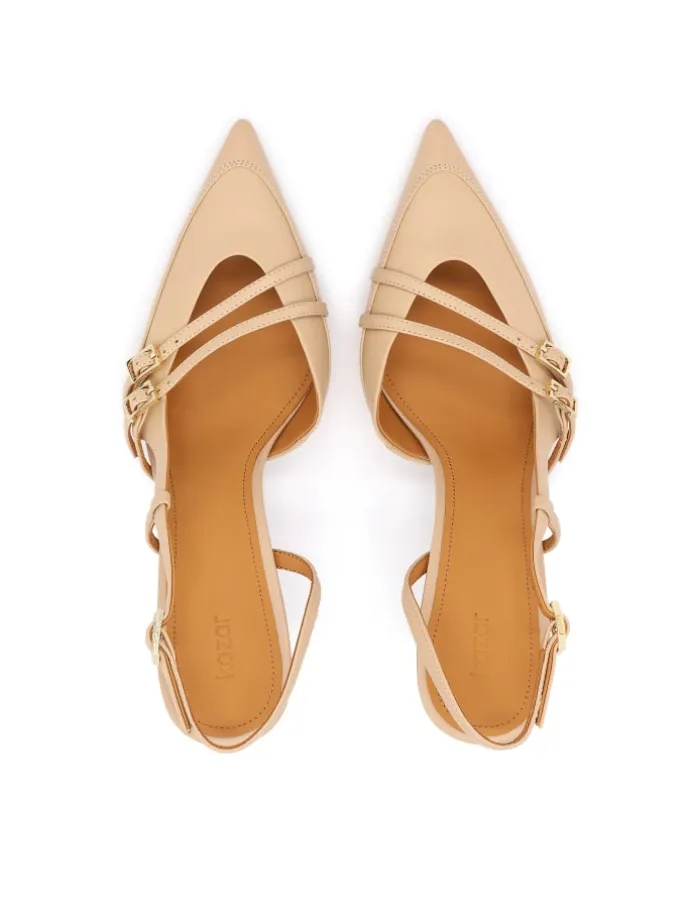 Die cremefarbenen Pumps aus Naturleder sind eine elegante Wahl für alle, die Klassiker in moderner Ausführung schätzen. Das Slingback-Modell mit offener Ferse legt den Fuß dezent frei und verleiht jedem Styling Leichtigkeit. Die schlanke, spitze Nase ist mit zarten Riemen mit Schnallen verziert, die einen interessanten Akzent setzen und den raffinierten Charakter der Schuhe unterstreichen. Die aus Leder gefertigten Pumps verbinden auf perfekte Weise Strapazierfähigkeit mit Komfort und sind damit eine stilvolle Wahl sowohl für formelle als auch für legere Anlässe.