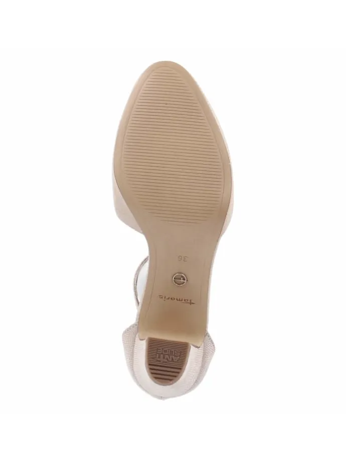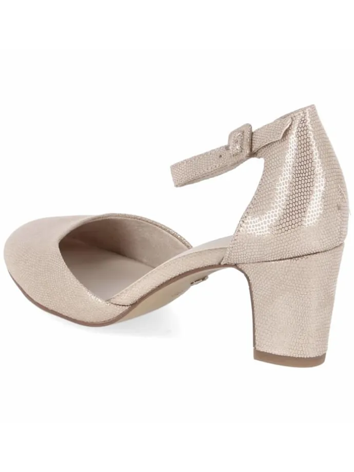 Feinsinnige Details prägen diesen Riemchenpumps von Tamaris: Das goldene Metallic-Finish mit sehr feinem Reptilmuster verleiht dem Textil-Obermaterial Tiefe, die runde Spitze und der 6 cm hohe Blockabsatz sorgen für eine ausgewogene, feminine Linie. Für langanhaltende Bequemlichkeit stehen das gepolsterte Fußbett, die geschmeidig flexible Laufsohle und die Schnalle mit Elastikeinsatz, die sicheren Halt mit angenehmer Bewegungsfreiheit verbindet. Die Passform fällt normal aus, Weite F 1/2 ergänzt den Tragekomfort. Mit synthetischer Decksohle und vollständig veganer Materialauswahl zeigt das Modell Stilbewusstsein ohne tierische Anteile. Vielseitig kombinierbar, vom sommerlichen Anlass bis zum dezenten Business-Look. Modetipp: In Kombination mit einem schwarzen Slipdress und einem Blazer in Beige wirkt der Goldton besonders modern.