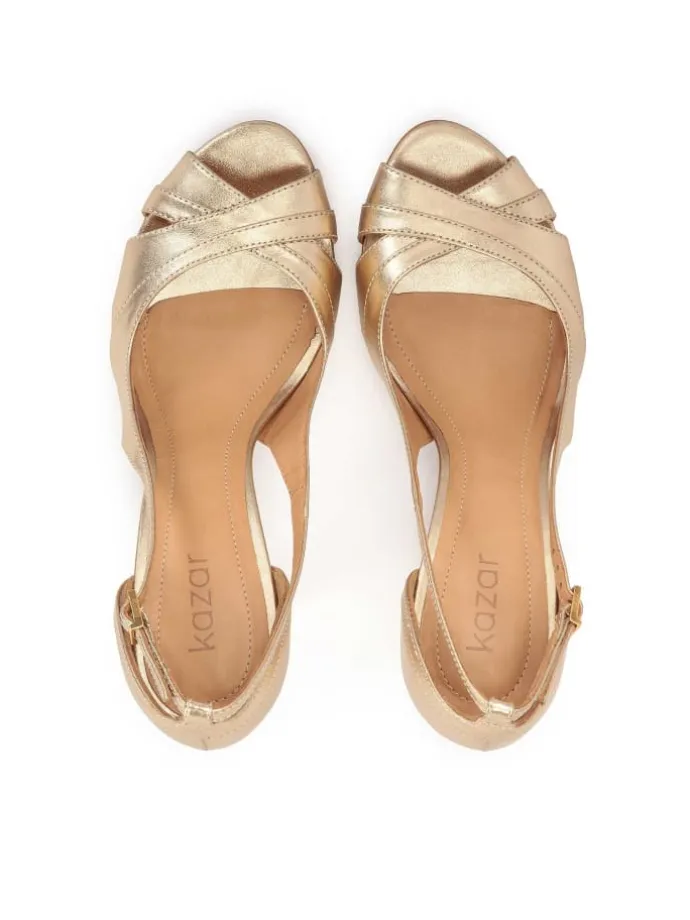 Die aus hochwertigem Narbenleder gefertigten Pumps sind ein absoluter Ausdruck von Luxus und raffiniertem Geschmack. Die offene Nase offenbart Subtilität und Sinnlichkeit, während der ausgeschnittene Schaft mit einem dekorativen Riemen mit Schnalle ihnen außergewöhnliche Eleganz verleiht und der hohe Absatz die Silhouette wunderschön anhebt und modelliert. Die Pumps in edlem Gold passen sowohl zum Alltags- als auch zum Abendstyling.