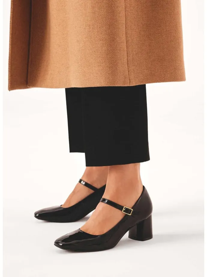 DieLacklederpumps mit breitem, niedrigem Absatz sind das perfekte Accessoire für elegante und formelle Outfits. Sie verfügen über einen Schnallenriemen auf dem Spann, der für Halt und Komfort beim Tragen sorgt. Außerdem garantiert die perforierte Innensohle Komfort und eine gute Belüftung des Fußes, auch bei langem Tragen. Diese Pumps sind eine ausgezeichnete Wahl für Frauen, die Stil, Komfort und Qualität schätzen. Mit ihrem klassischen Design und ihrer robusten Konstruktion sind sie eine perfekte Ergänzung für jeden Kleiderschrank. Die Pumps sind mit einer konturierten, perforierten Komfortsohle aus semianilinem Ziegenleder ausgestattet, die sich der Form des Fußes anpasst und Feuchtigkeit perfekt absorbiert.