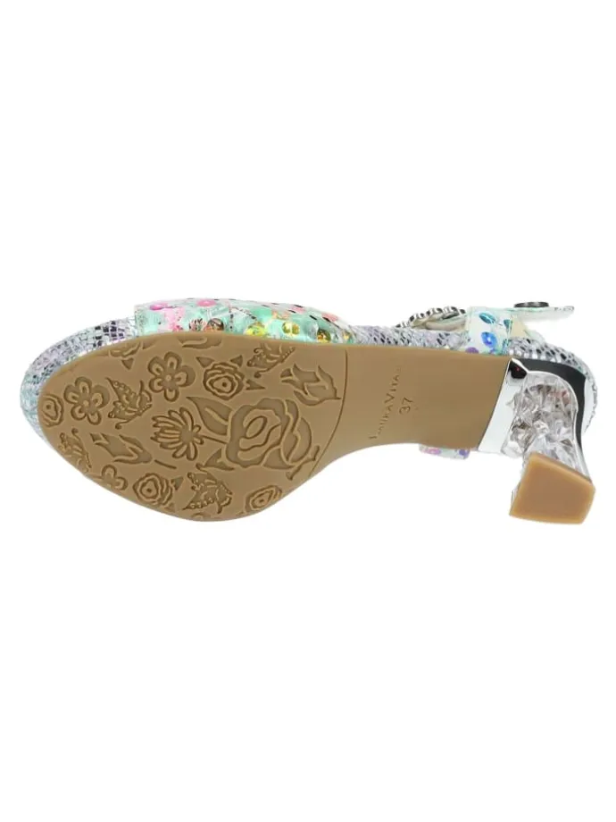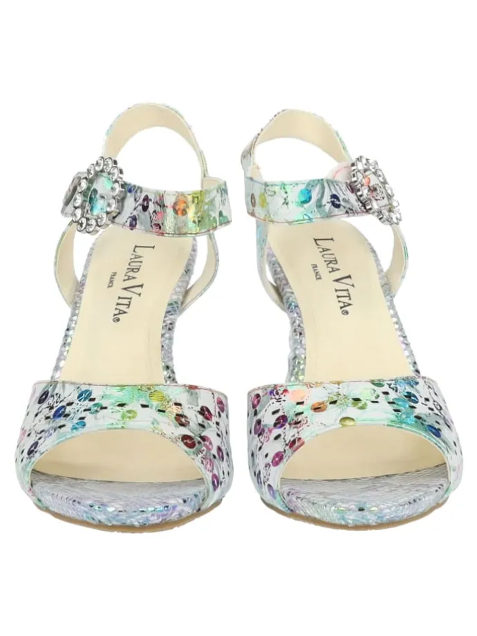Mit dieser stilvollen Sandalette von Laura Vita ist jeder Ihrer Auftritte unvergesslich! Das exklusive und zugleich raffinierte Design macht den Schuh zu einem wahren Must-Have für die neue Saison! Ein echtes Highlight wird dieser hübsche Schuh durch das farbenfrohe Muster und dem wunderschönen Absatz in Kristall-Optik.Der versteckte Klettverschluss sorgt für eine optimale Passform.