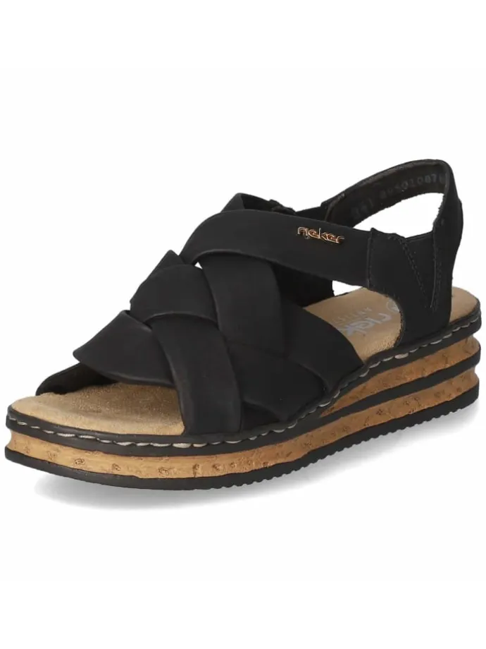 Diese Damen-Sandalen von Rieker verbinden praktische Features mit stilvoller Zurückhaltung. Das pflegeleichte Synthetik-Obermaterial zeigt sich widerstandsfähig im Alltag, die offene Spitze verleiht sommerliche Frische. Zwei kleine Elastikeinsätze erlauben ein rasches Hineinschlüpfen ohne Verschluss und sichern bequemen Halt. Innen sorgen gepolstertes Fußbett und Textildecksohle für angenehme Weichheit, die rutschhemmende Laufsohle gibt Sicherheit bei jedem Schritt. Ein goldfarbenes Markenlogo unterstreicht den sympathischen Look dezent. Die Passform fällt normal aus und bietet eine zuverlässige Basis für verschiedenste Outfits. Modetipp: Zu einer Leinen-Bermuda, gestreiftem Oversize-Hemd und Sonnenbrille entsteht ein maritim inspirierter Look mit moderner Note.