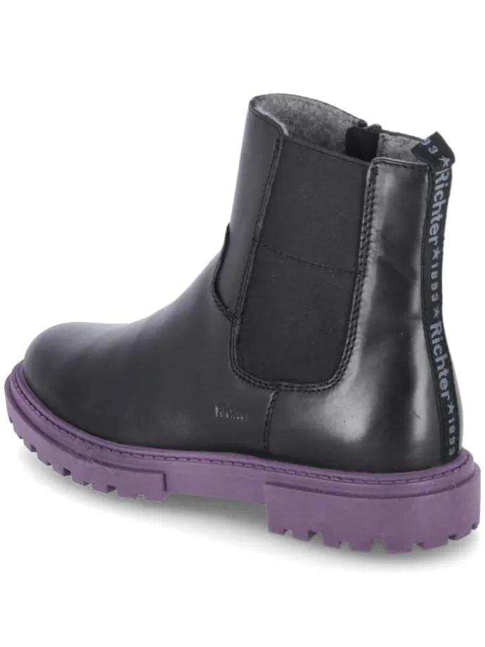 Als stilvoller Allrounder präsentiert sich dieser Chelsea Boot von Richter in schwarzem Glattleder und mit markanter lila Profilsohle. Die runde Schuhspitze, ein 3 cm Blockabsatz und die verstärkte Ferse bieten Stabilität, während der Reißverschluss in Kombination mit dem elastischen Einsatz und der Anziehlasche das An- und Ausziehen erleichtert. Ein leicht warmes Textilfutter sowie die weiche Textildecksohle sorgen für angenehmes Klima und Komfort an kühleren Tagen. Das robuste Echtleder überzeugt durch Langlebigkeit, die rutschhemmende Sohle unterstützt sicheren Halt im Alltag von Grundschulkindern. Größenhinweis: fällt normal aus und eignet sich damit für den täglichen Einsatz. Modetipp: In Kombination mit Leggings, Oversize-Sweatshirt und einer farblich abgestimmten Mütze entsteht ein sportiv-cooler Look mit dezentem Farbakzent.