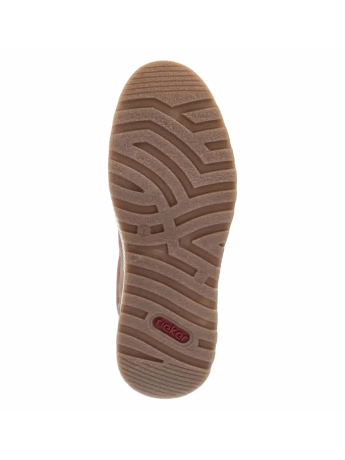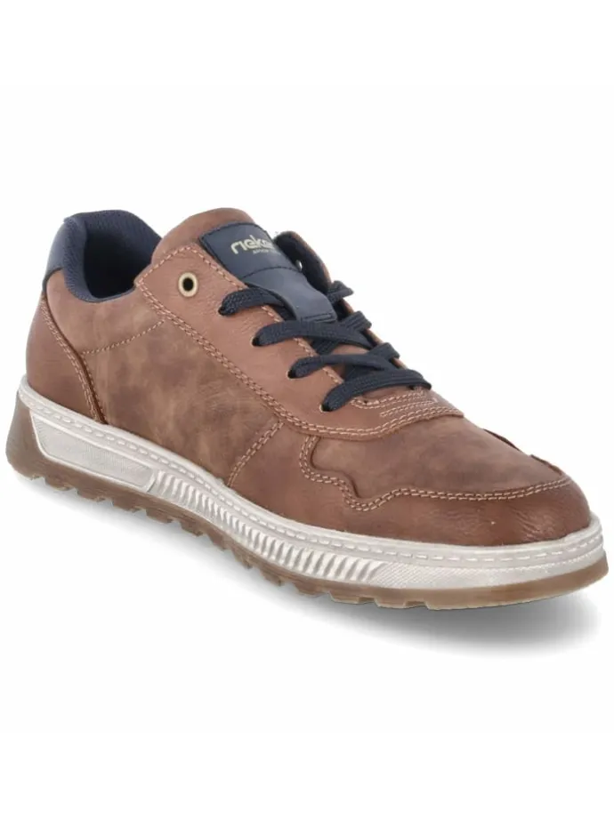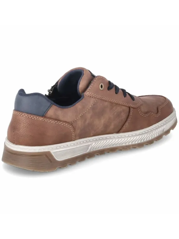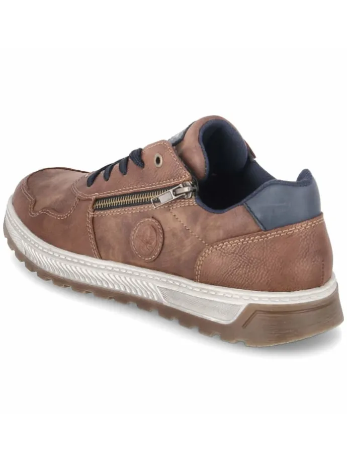 Als vielseitiger Begleiter präsentiert sich dieser Rieker-Halbschuh in Braun mit sportlicher Ausstrahlung und lässiger Used-Optik. Dunkelblaue Highlights geben dem Design Tiefe, das synthetische Obermaterial bleibt dabei angenehm pflegeleicht. Die runde Spitze, der normal ausfallende Schnitt sowie der gepolsterte Einstieg treffen auf eine weiche, textile Decksohle fürs spürbare Fußwohl. Eine flexible, rutschhemmende Laufsohle liefert verlässliche Traktion, verstärkte Fersen- und Zehenbereiche stabilisieren den Auftritt. Die Kombination aus Schnürsenkeln und Reißverschluss vereint Komfort und Passgenauigkeit. So entsteht ein alltagstauglicher Schuh mit sportlichem Charakter. Modetipp: Zu dunkelblauer Chino und Strickpolo oder unter einer leichten Utility-Jacke mit Denim entfaltet das Modell seine moderne Wirkung.