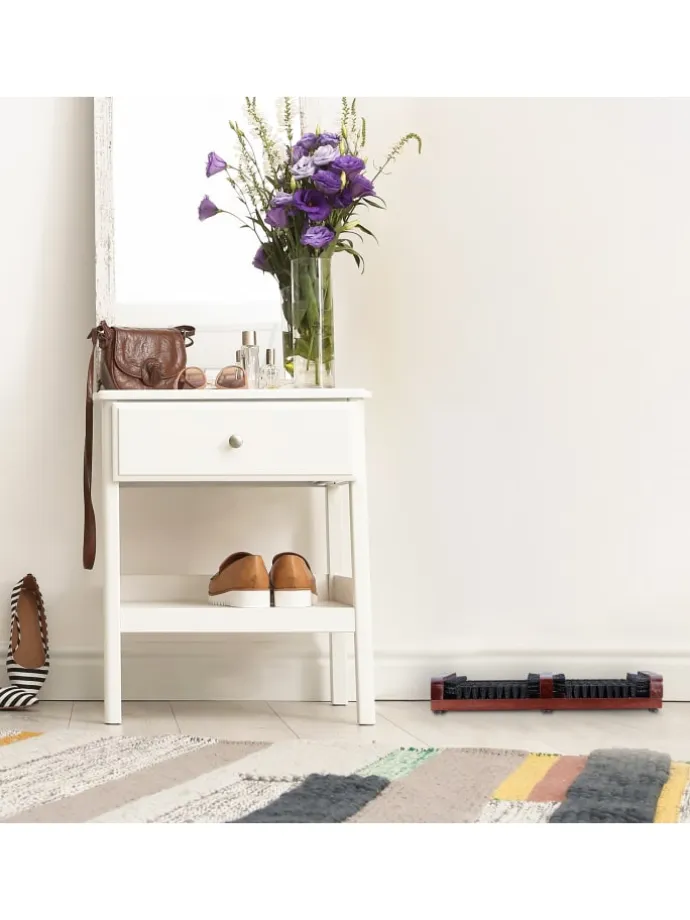 Nutze den Schuhabstreifer aus Holz, um Deine Schuhe nach einem Spaziergang mit Deinem Vierbeiner oder nach getaner Gartenarbeit mühelos zu säubern. Die robusten Kunststoffbürsten, die im stabilen Hartholz verankert sind, reinigen Deine Schuhe unterhalb und seitlich durch einfaches Vor- und Zurückschieben der Füße. Spezielle Gummistreben an der Unterseite des Schuhreinigers vermindern Rutschen und verhindern Kratzschäden am Boden. Der Fußabstreifer verschafft Dir überall sauberes Schuhwerk.