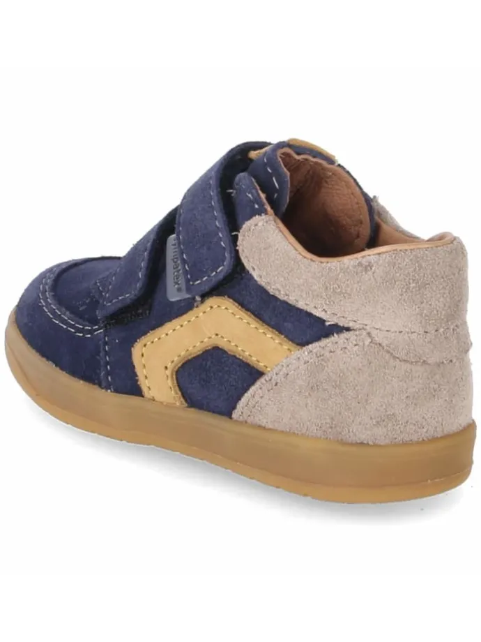 Als verlässlicher Begleiter im Kita-Alltag setzt der Pepino NIRU funktionale Akzente. Das Obermaterial aus dunkelblauem Rauleder ist strapazierfähig, die graue Ferse und der gelbe Zierstreifen sorgen für frische Kontraste. Zwei praktische Klettriemen ermöglichen schnelles Anziehen, der gepolsterte Einstieg sowie die runde Zehenform schenken Komfort. Die Sympatex-Ausstattung hält Feuchtigkeit draußen, während das Innenklima dank Atmungsaktivität angenehm bleibt. Eine flexible, trittsichere Laufsohle unterstützt erste Lauferfahrungen, verstärkte Partien an Zehen und Ferse schützen bei jedem Schritt. Die lederne Decksohle und das herausnehmbare Fußbett erleichtern die Pflege, die Passform fällt normal aus. Modetipp: Zu einer wetterfesten Übergangsjacke in Marine und einer bequemen Cordhose harmoniert der Schuh besonders gut; gelbe Details im Outfit greifen den Streifen stilvoll auf.