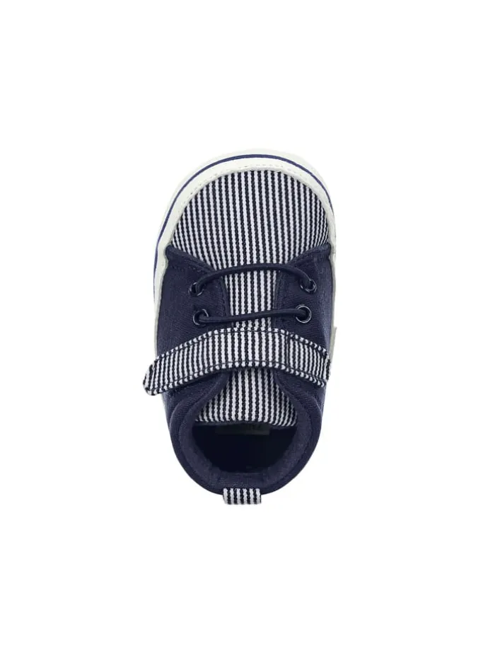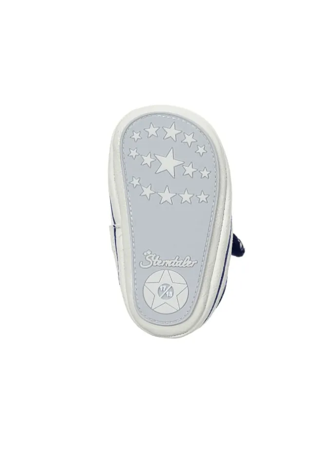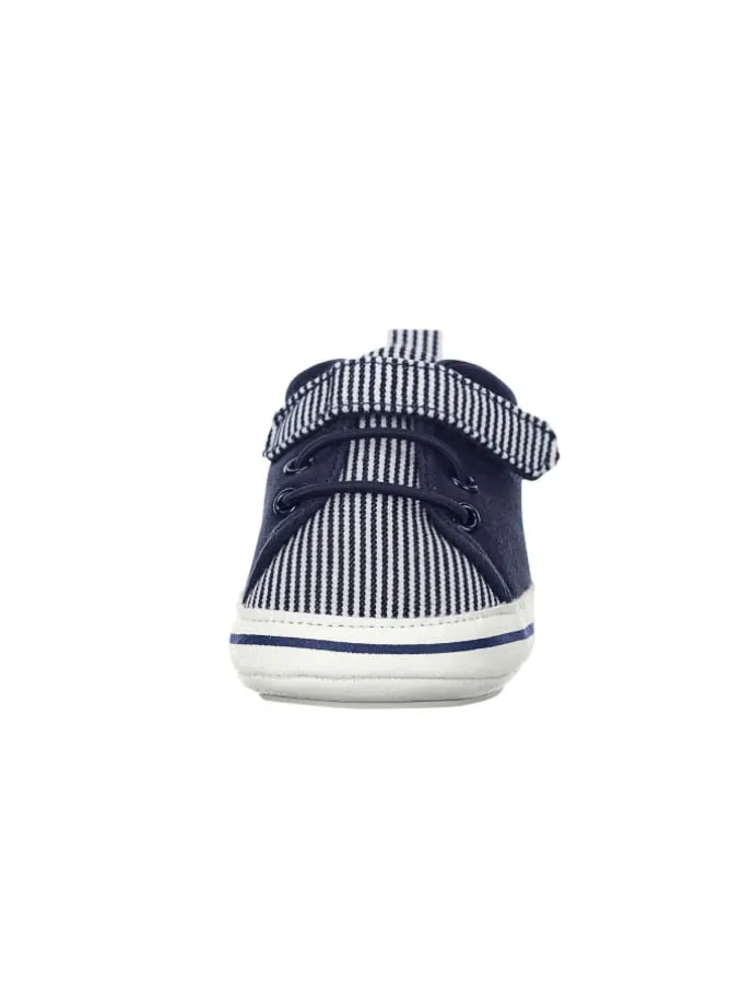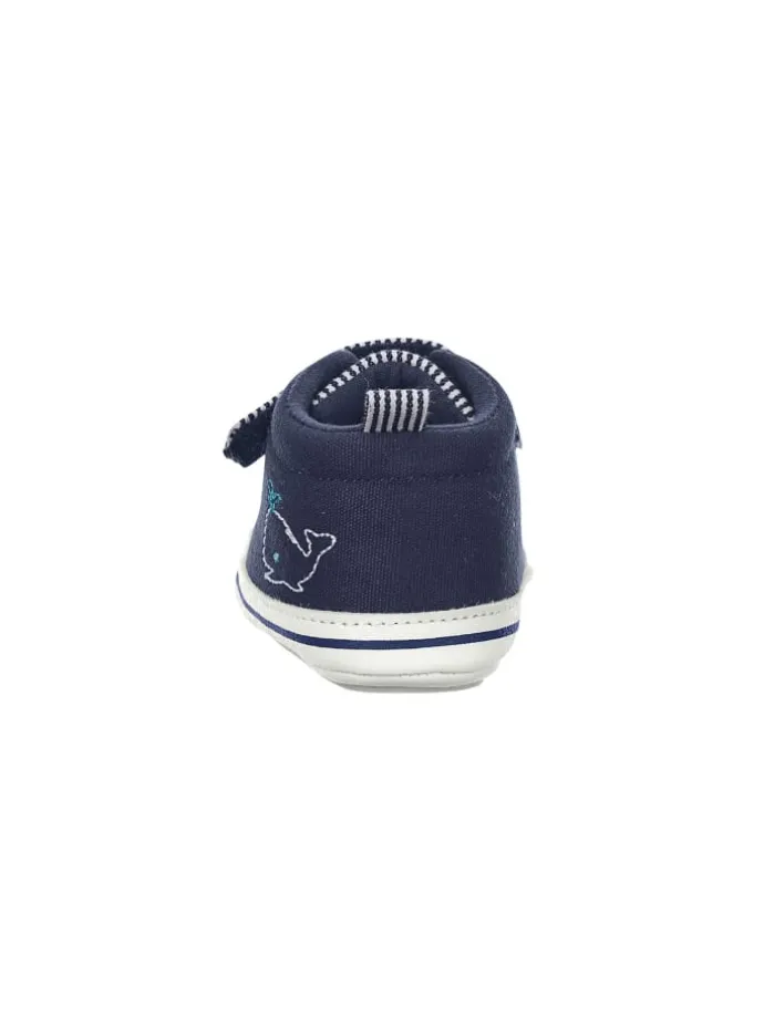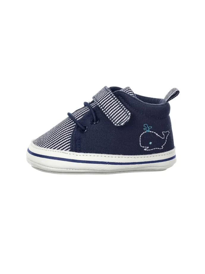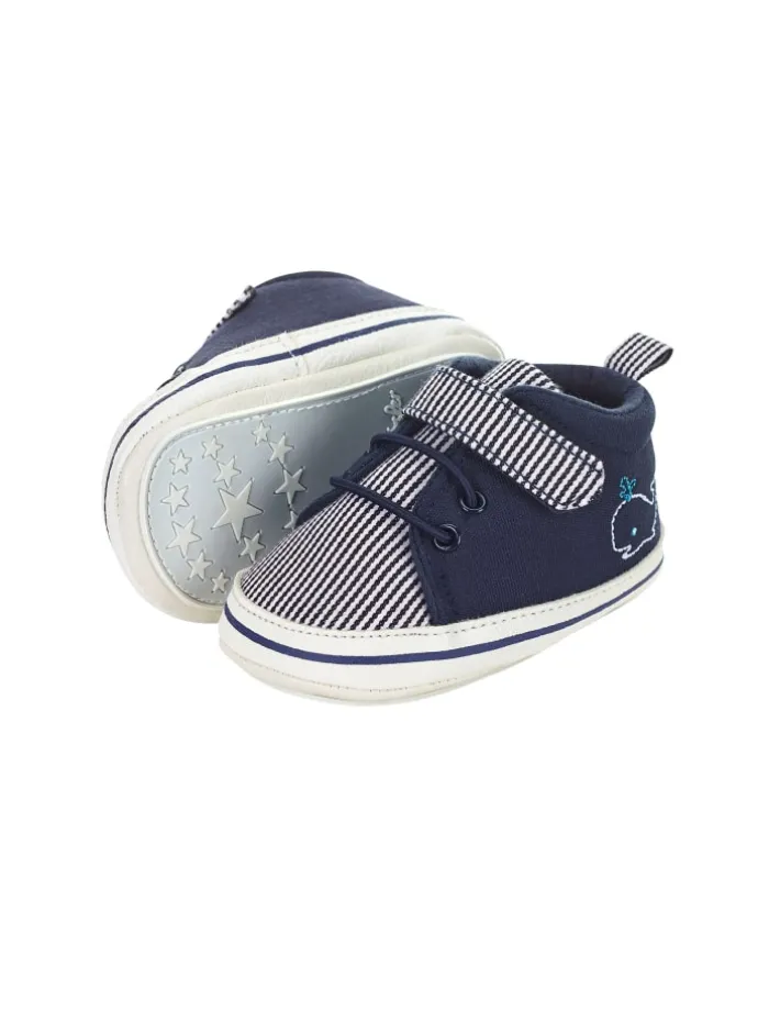 Baby Schuhe aus Baumwollstoff bedruckt mit Streifen /// Barfußgefühl ///Walfisch Stickerei /// mit Klettverschluss /// elastischen Schnürsenkeln /// aufgenähte rutschfeste Sternensohle /// gefüttert mit Jersey