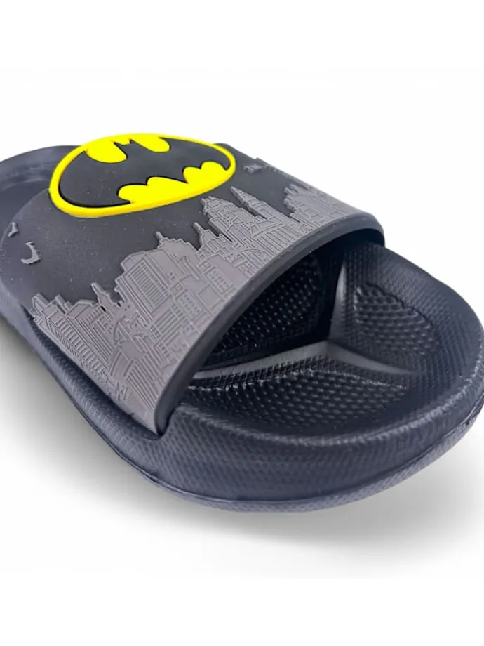 Das markante Batman-Logo und die Stadtsilhouette machen die Badeschuhe zu einem echten Blickfang.