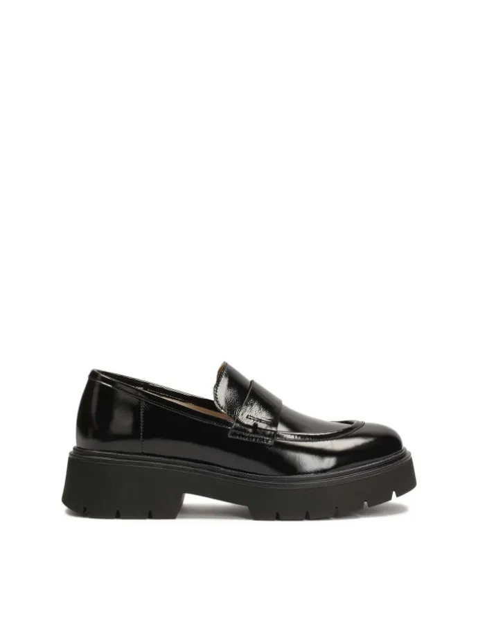 Die schwarzen flachen Damenschuhe aus hochwertigem Narbenleder sind ein klassisch geschnittenes Modell in moderner und extravaganter Ausführung. Ein schlichter Schaft zum Hineinschlüpfen mit dem für Loafer typischen Kreuzriemen wird mit einer Stollensohle mit ausgeprägtem Absatz und Profil gepaart. Die ultra-bequemen flachen Schuhe sind die perfekte Ergänzung zu Ihrem Alltagslook.