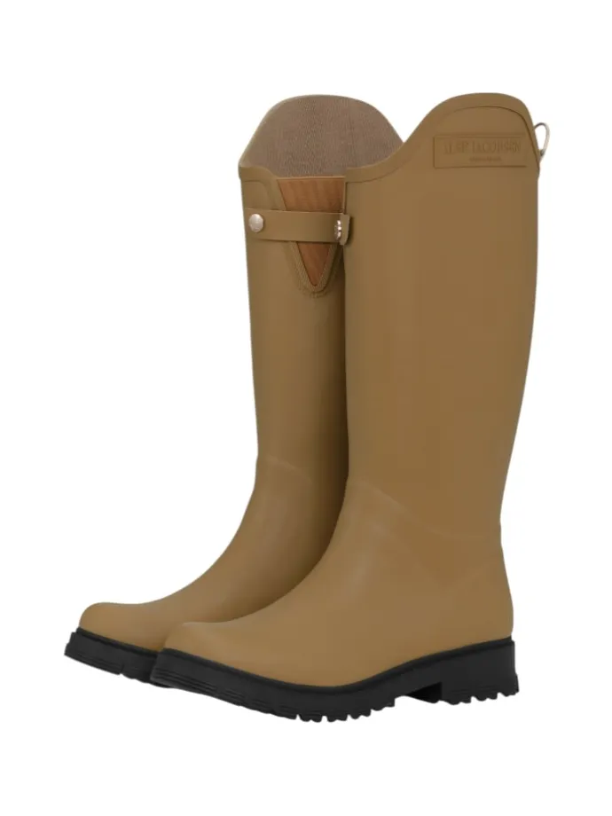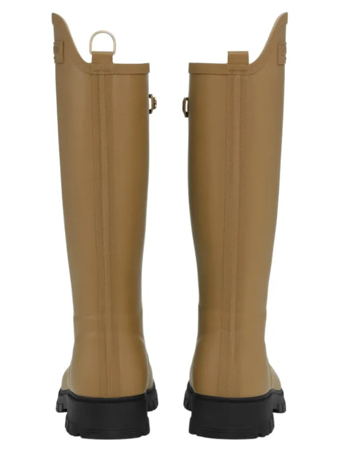 Kniehohe, asymmetrische Gummistiefel. Eine Kombination aus Stil und Funktionalität für regnerische Tage. Mit einem dekorativen D-Ring in der hinteren Mitte und einem Logo auf dem Schaft. Elastischer Gummizug für einfachen Einstieg und ein Riemen mit goldenen Logo-Knöpfen für die Dekoration. Die Gummisohle sorgt für eine hervorragende Traktion auf nassen Oberflächen.