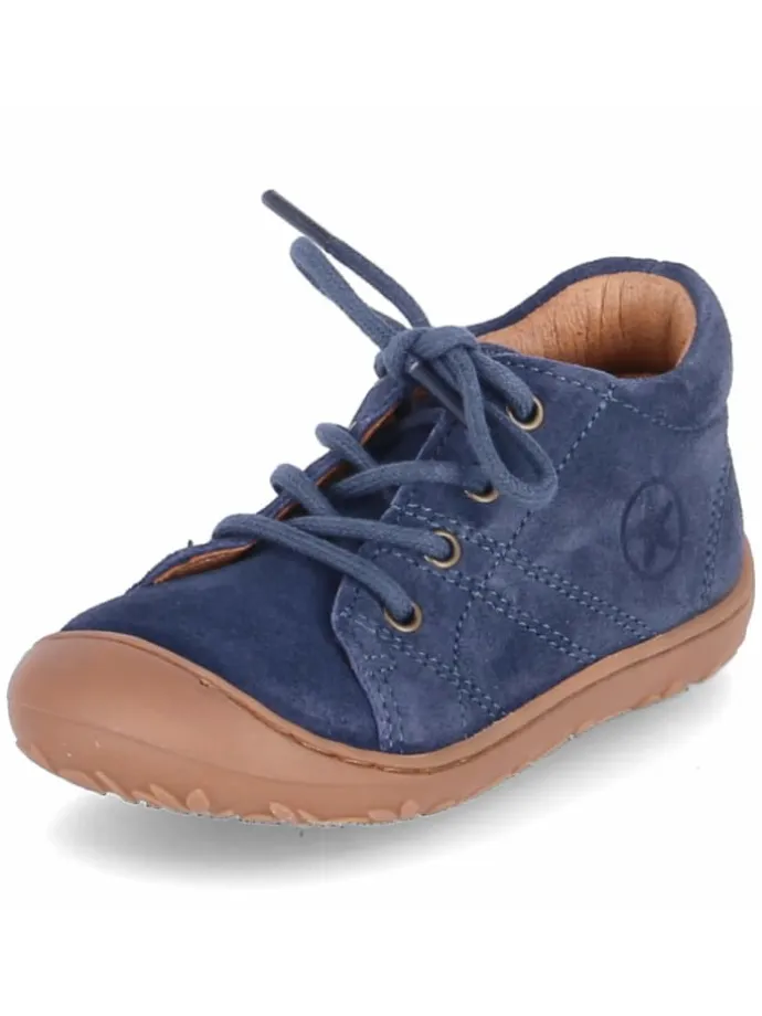 Mit dem Modell HALE I präsentiert Bisgaard einen Kleinkind-Schnürschuh, der Alltag, Spiel und Familienfeier souverän meistert. Das blaue Obermaterial aus Rauleder überzeugt als strapazierfähiges Echtleder, ergänzt durch Lederfutter und eine hautfreundliche Lederdecksohle. Größengetreu konzipiert, lässt sich der Sitz per Schnürung feinjustieren. Der gepolsterte Einstieg erhöht den Tragekomfort, die flexible, rutschhemmende Laufsohle mit Zehenkappe sorgt für Halt und schützt den Vorderfuß. Praktisch im Alltag: das herausnehmbare Lederfußbett, das zum Lüften oder Auswechseln rasch entnommen ist. Die runde Schuhspitze begünstigt eine natürliche Fußentwicklung. Dank der klaren Linien und der satten Blaufarbe eröffnen sich zahlreiche Kombinationsmöglichkeiten vom Kuschelanzug bis zur Stoffhose. Modetipp: Zu einer gesteppten Weste und gerollten Chinos entsteht ein lässiger, zugleich gepflegter Look.