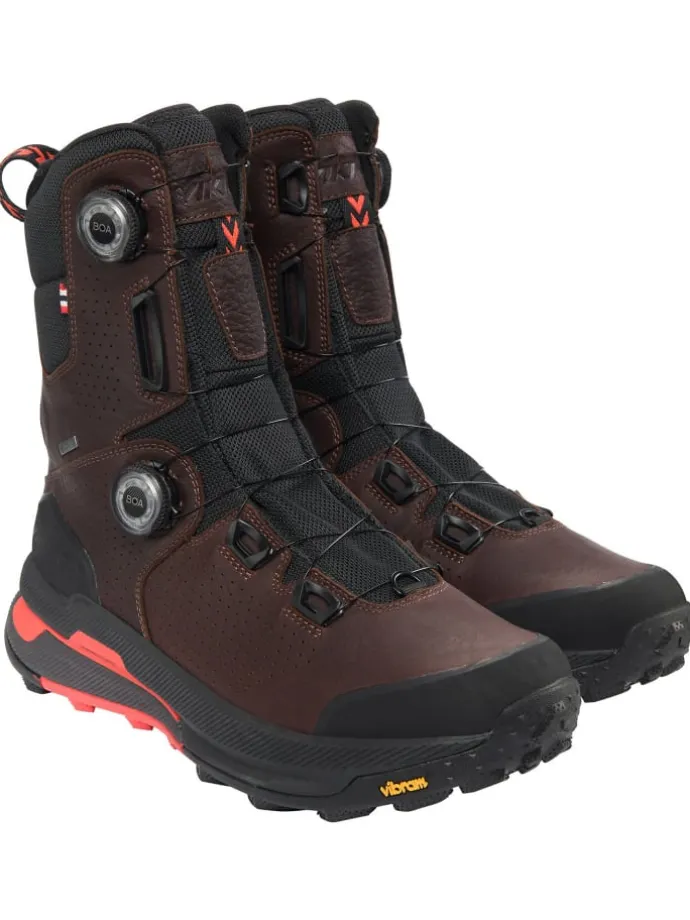 Das hoch geschnittene Obermaterial des Villrein Pro High Gtx Boa von VIKING für Herren aus leichtem und strapazierfähigem Känguruleder sorgt für solide Stabilität im Bereich des Sprunggelenks, während eine wasserdichte Gore-Tex Membran die Füße vor Feuchtigkeit schützt.