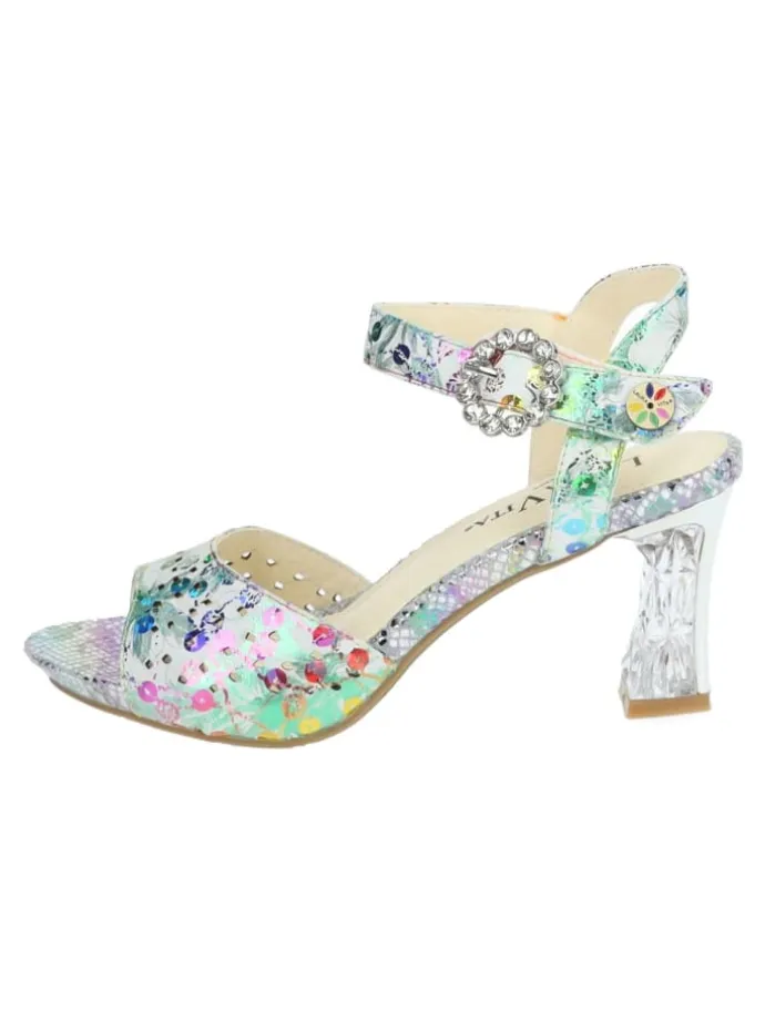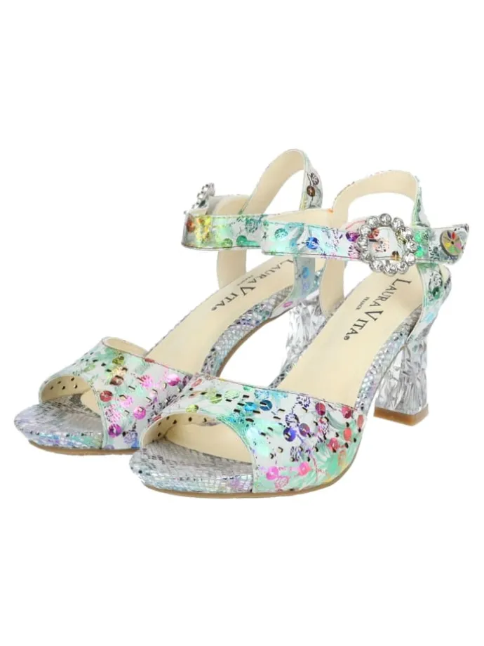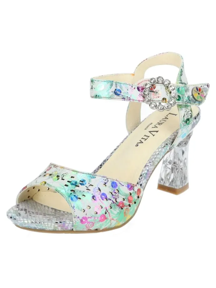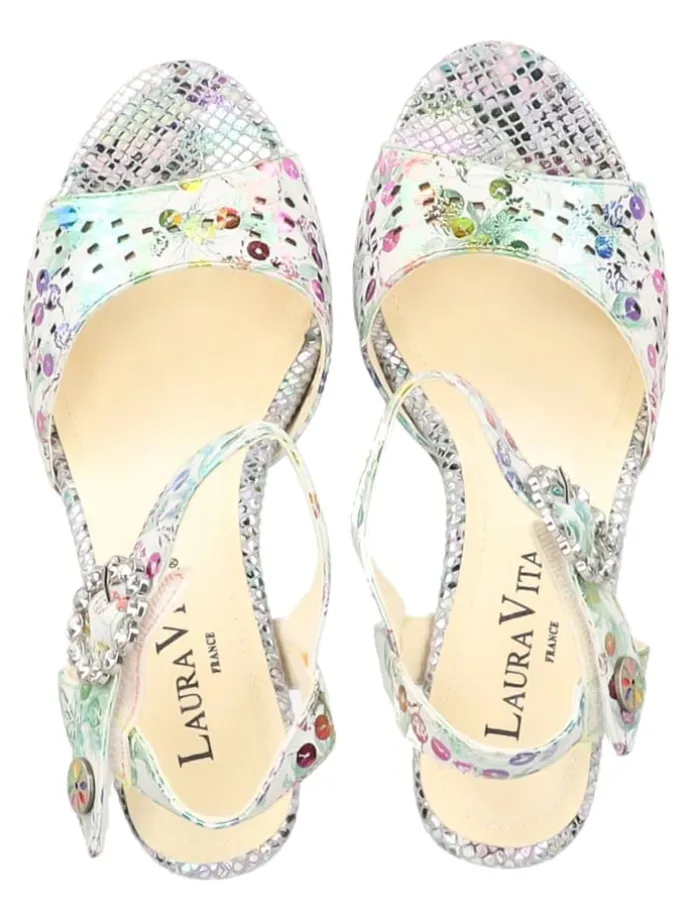 Mit dieser stilvollen Sandalette von Laura Vita ist jeder Ihrer Auftritte unvergesslich! Das exklusive und zugleich raffinierte Design macht den Schuh zu einem wahren Must-Have für die neue Saison! Ein echtes Highlight wird dieser hübsche Schuh durch das farbenfrohe Muster und dem wunderschönen Absatz in Kristall-Optik.Der versteckte Klettverschluss sorgt für eine optimale Passform.