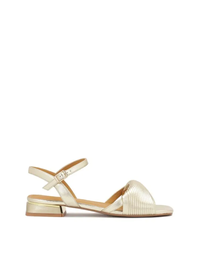 Elegante goldene Sandalen aus hochwertigem Vollnarbenleder werden am Knöchel geschlossen und sorgen für Stabilität und Komfort. Der breite, verzierte Riemen auf der Vorderseite verleiht ihnen Schick und Eleganz, was sie zu einer idealen Wahl für viele Gelegenheiten macht. Die Sandalen haben einen flachen, breiten Absatz, der ein bequemes Gehen garantiert. Durch ihr klassisches Design passen sie zu vielen Outfits, sowohl formell als auch leger. Goldene Sandalen aus genarbtem Leder sind eine Option für Frauen, die Komfort, Stil und Eleganz schätzen.