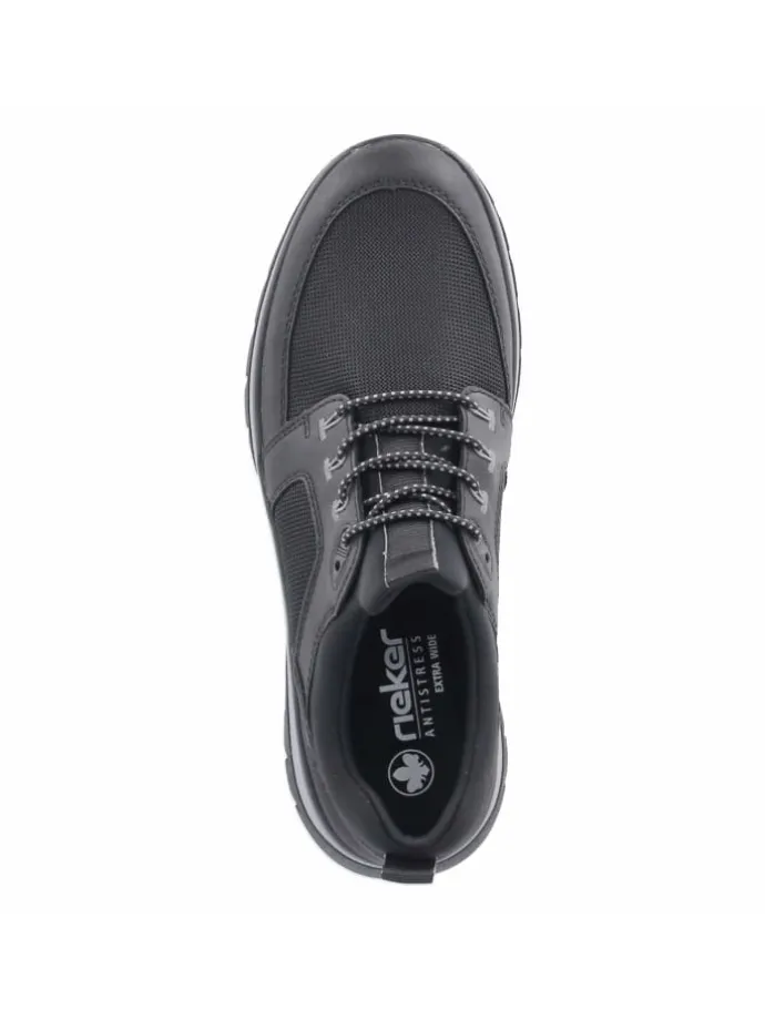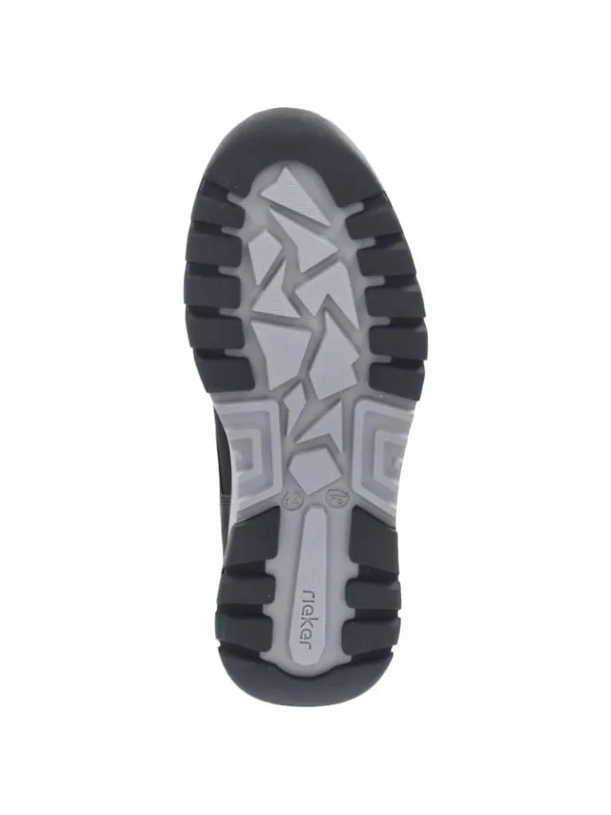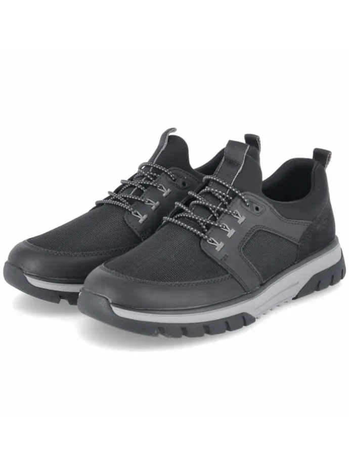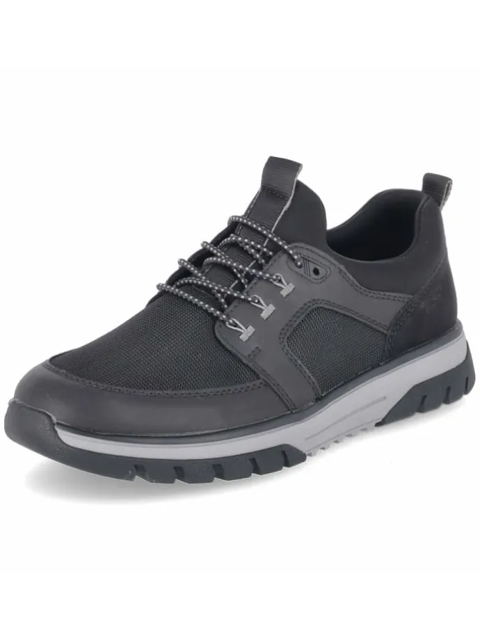 Zeitgemäßer Herren‑Slipper von Rieker, der Komfort und sportliche Eleganz vereint. Die Kombination aus Textil und Synthetik zeigt eine moderne, pflegeleichte Oberfläche, die im Alltag schnell wieder sauber ist. Ein elastisches Band in Schnüroptik akzentuiert den Spann und ermöglicht einen schnellen Einstieg, das weiche, neoprenähnliche Futter erhöht den Tragekomfort spürbar. Das gepolsterte Wechselfußbett unterstützt den Fuß und kann gegen eigene Einlagen getauscht werden. Für sicheren Stand sorgt die flexible, rutschhemmende Profilsohle, während verstärkte Fersen‑ und Zehenbereiche die Formstabilität verbessern. In klassischem Schwarz, mit runder Spitze und normaler Passform präsentiert sich der Schuh vielseitig, von urban bis business‑casual. Modetipp: All‑Black‑Outfit mit schmaler Anzughose, Feinstrick und minimalistischer Crossbody‑Bag wählen; dezente, gemusterte Socken setzen ein stilvolles Detail.