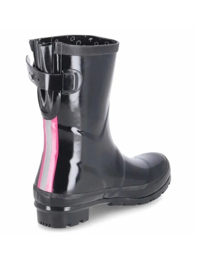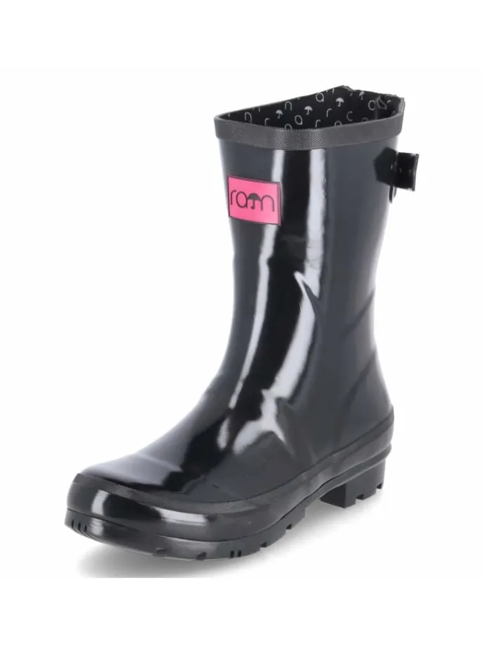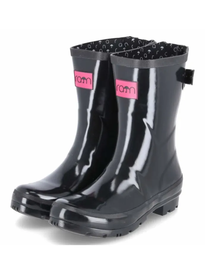 Der GLOSSY Gummistiefel von Rajn setzt auf moderne Eleganz und zuverlässige Performance bei Nässe. Die lackierte Optik in Schwarz wirkt stilvoll, rosa Akzente verleihen einen sportlich-femininen Twist. Das wasserabweisende Gummi, ein 3-cm-Blockabsatz und die runde Spitze bieten alltagstauglichen Komfort, unterstützt von einem gepolsterten, herausnehmbaren Wechselfußbett auf Textil. Stabilität liefern der verstärkte Fußrahmen und die verstärkte Ferse mit Reflektorstreifen, während die flexible, rutschhemmende Profilsohle sicheren Tritt ermöglicht. Dank Varioschaft und rückseitigem Riemen wächst die Schaftweite um bis zu 11 cm mit – perfekt zum Überziehen über Hosen oder für mehr Bewegungsfreiheit. Die pflegeleichte Oberfläche und die normal ausfallende Passform runden das Design ab. Modetipp: Mit A-Linien-Kleid und blickdichter Strumpfhose entsteht ein femininer Kontrast; ein Regenmantel in Pastell greift die rosa Details stimmig auf.