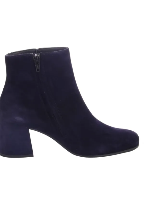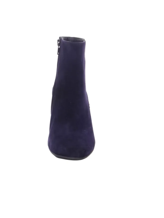 Schwarze Damen-Stiefelette aus Veloursleder mit Reißverschluss. Innen Chromfrei gegerbtes Leder. Normale Passform; Blockabsatz; Gummi-Laufsohle.